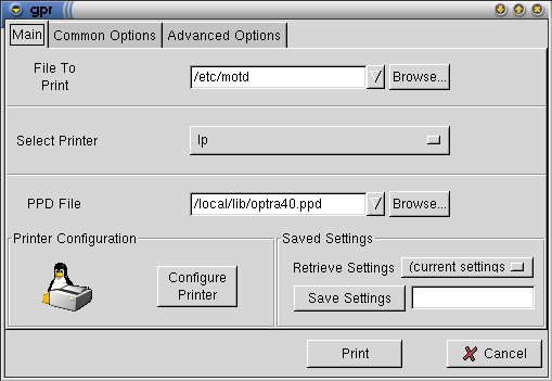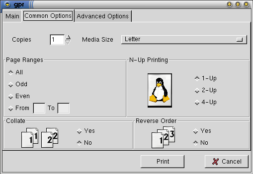 Once you've configured your printer in GPR, you can print jobs by specifying the filename and selecting the proper options from the `Common' and `Advanced' tabbed panels. The `Common' options are implemented directly by GPR for all printers, while the `Advanced' options are defined by the PPD file for your printer. You can see these option panels in Figure 8 and Figure 9.