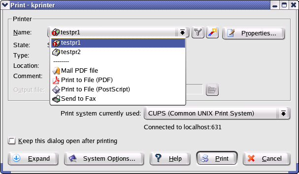 kprinter is the print dialog of KDEPrint which allows you to select the destination printer and change printer options. Among the destination printers, there are a few virtual printers allowing you to print to email, fax or pdf.