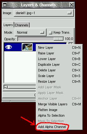 Instead of using the opacity slidebar to make the layer transparent, we will only be making part of the image transparent, sepcifcly everything except for the image of Daniel himself. In order to do this, we need to give the the image an alpha channel. To do this, position your mouse cursor overtop of the layer title and right click. This will produce a menu with some options. The option we want to choose is "Add Alpha Channel." After we choose this option, the alpha channel will be added and you will see in the image window's title bar it now says (RGB-alpha).