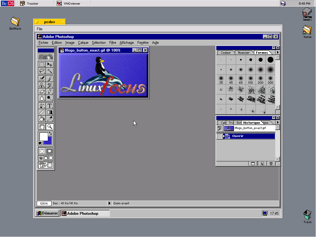 Si vous avez une licence Photoshop, vous pouvez lancer Photoshop sur la machine BeOS comme vous le feriez sur la machine NT. Cela signifie qu'une fenêtre représentant le bureau NT s'ouvre sur votre écran BeOS: vous travaillez sur la station NT!